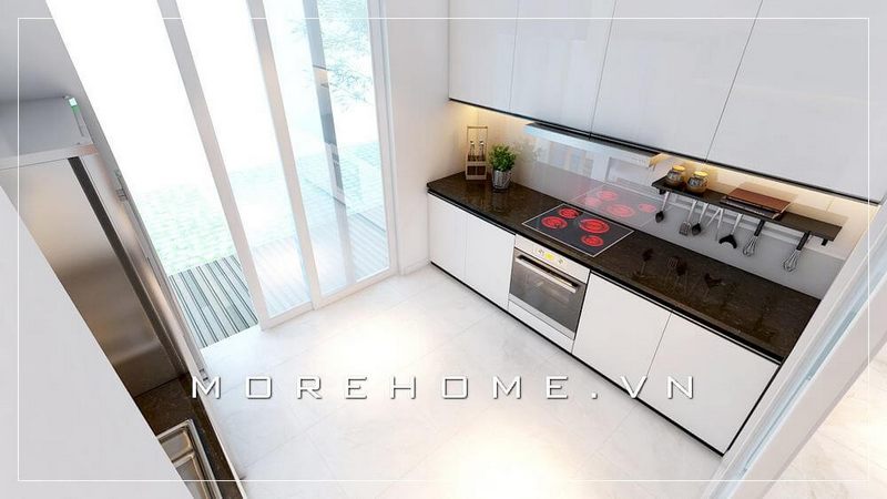 Thiết kế nội thất phòng bếp sử dụng tone màu trắng chủ đạo tạo nên không gian sạch sẽ, sang trọng và tiện nghi cho người nội trợ