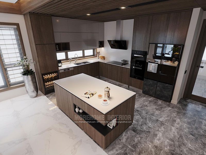 Thiết kế phòng bếp biệt thự sang trọng với nội thất tone màu nâu trầm mang đến không gian ấm cúng và sang trọng