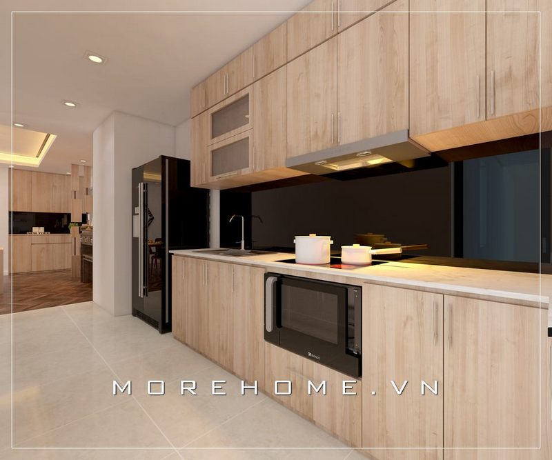 Thiết kế phòng bếp chung cư theo phong cách hiện đại, nội thất gỗ công nghiệp đơn giản và tiện nghi cho nhà chung cư