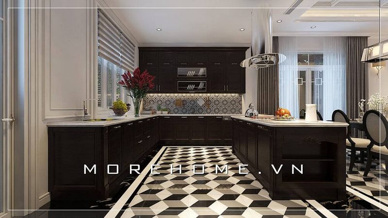 Thiết kế phòng bếp biệt thự tân cổ điển sang trọng với nội thất gỗ tự nhiên tone màu nâu ấm cúng và sang trọng