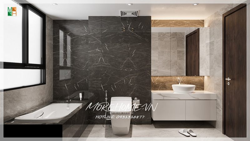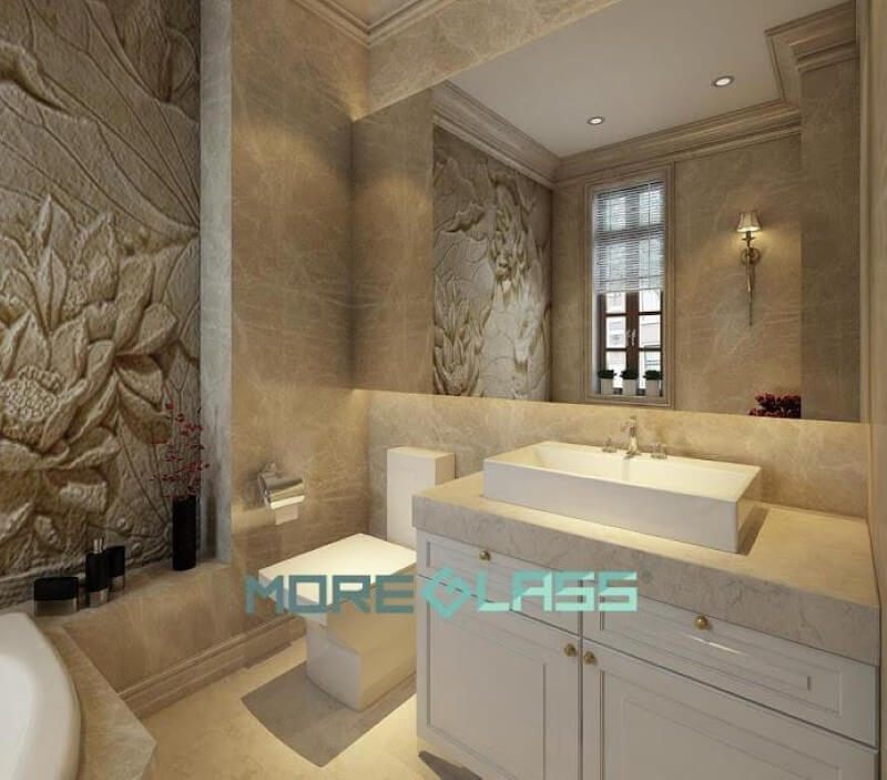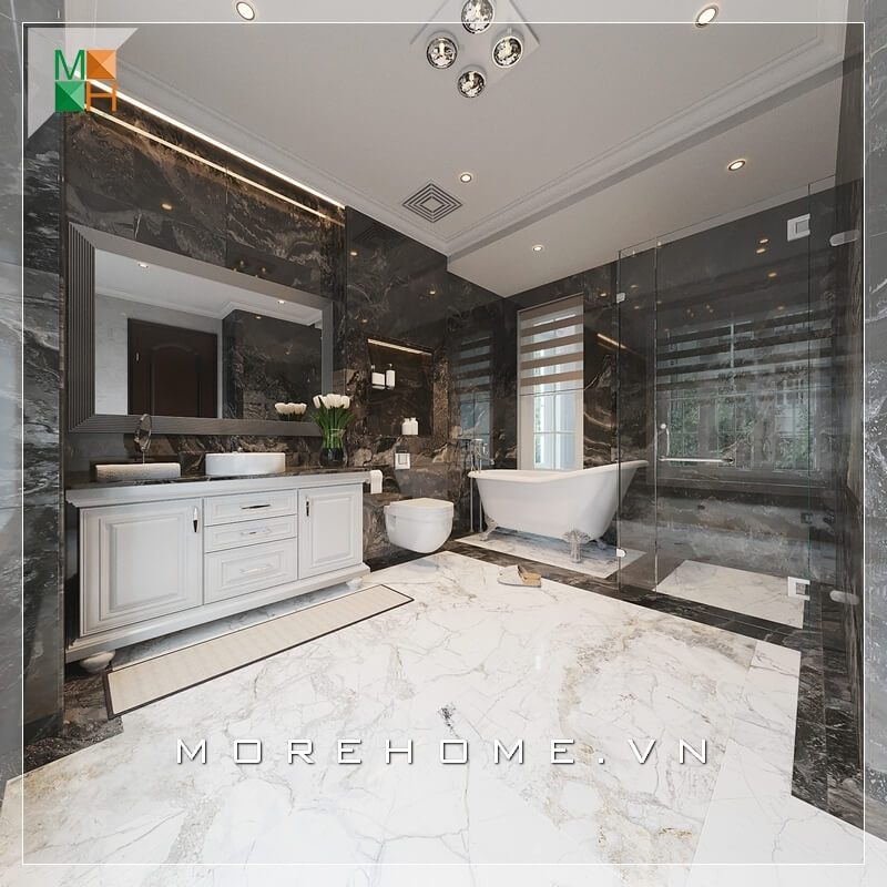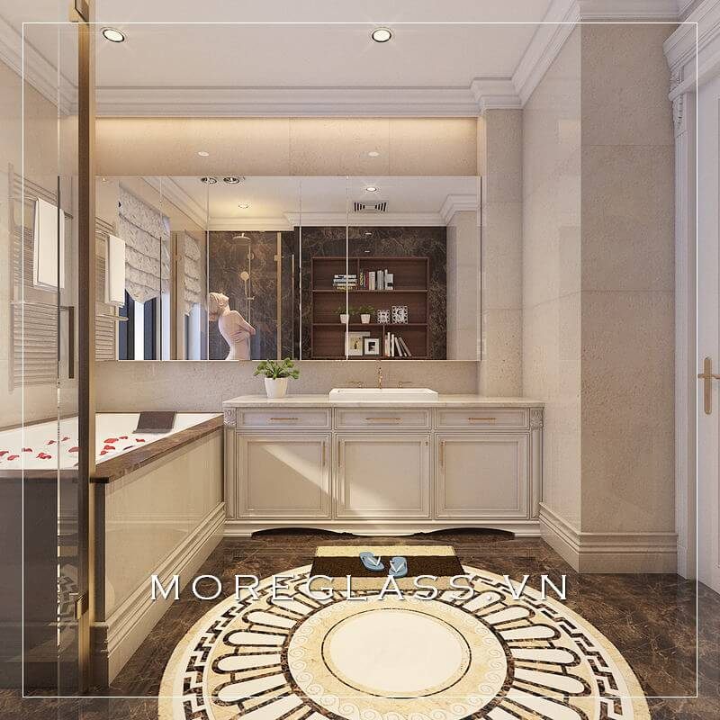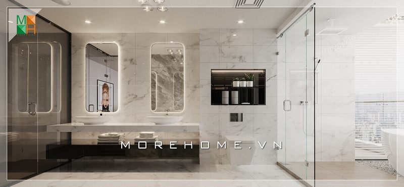 Nhà tắm sử dụng gương soi cao cấp rộng bao trùm không gian nhà tắm tạo cảm giác thông thoáng và rộng rãi hơn.