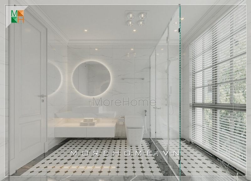 Mẫu gương tròn độc đáo là điểm nhấn ấn tượng trong thiết kế nội thất phòng tắm hiện đại của biệt thự, nhà phố