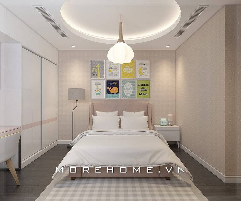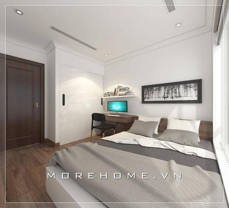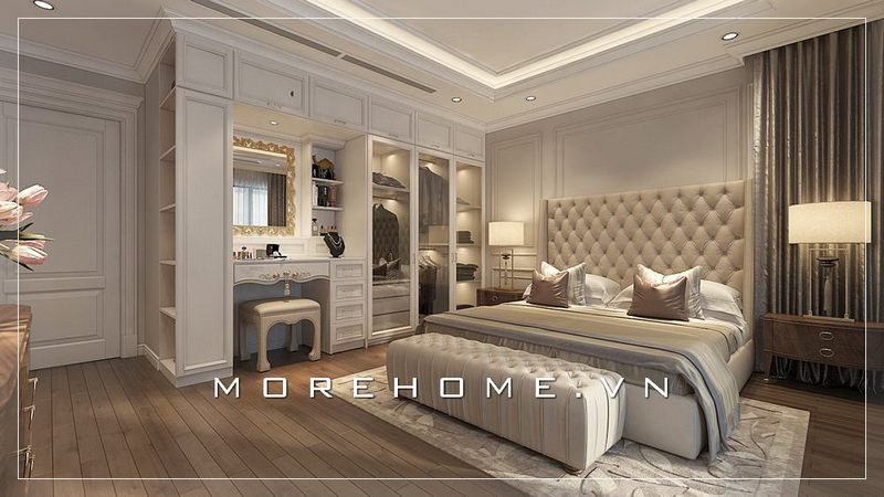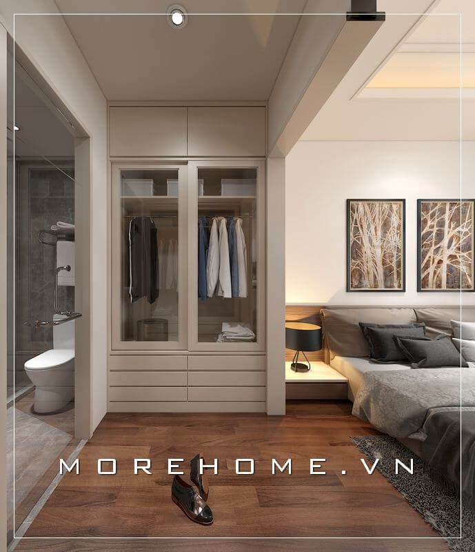 Thiết kế kệ tủ quần áo âm tường cũng góp phần lớn tiết kiệm không gian cho căn phòng