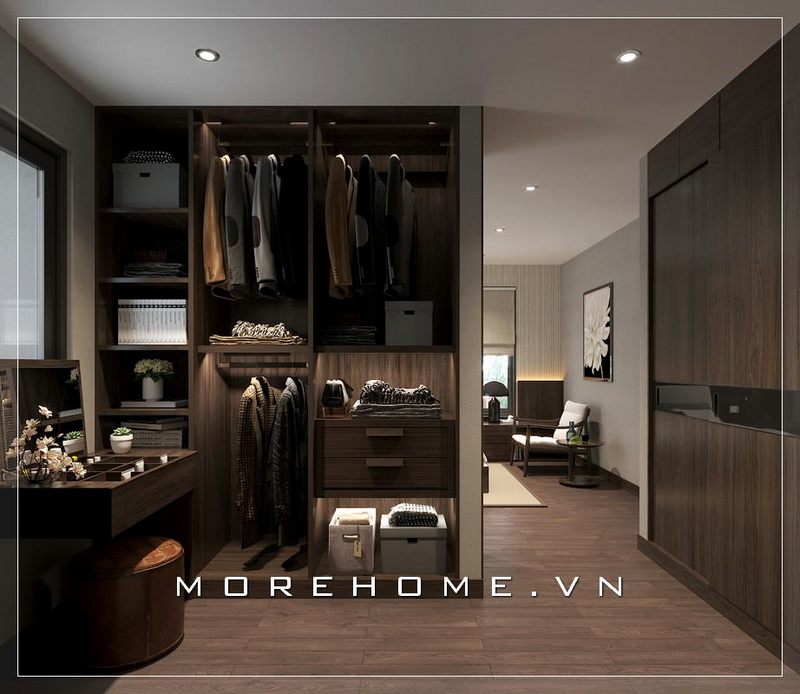 Không đơn thuần chỉ là một căn phòng để đồ đơn điệu của căn hộ chung cư, nhà phố, biệt thự mà nhà thiết kế rất sáng tạo khi thiết kế hai tủ đồ gỗ cánh kính hiện đại hai bên tường, vừa tận dụng được không gian mà còn thể hiện tính thẩm mỹ cao.