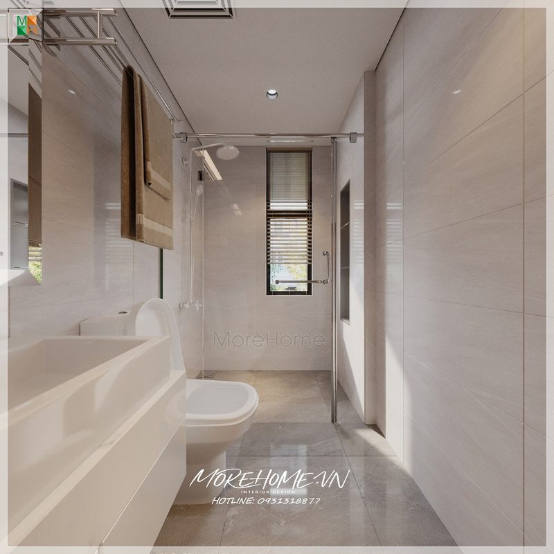 Mẫu thiết kế phòng tắm hiện đại, tối giản về nội thất, chỉ để những vật dụng cần thiết kết hợp tông màu gạch ốp lát tươi sáng tạo không gian phòng khách thông thoáng