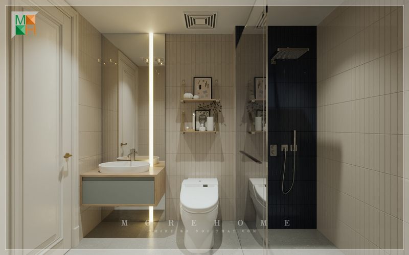 Phòng tắm với không gian nhỏ thiết kế tông màu sáng tạo cảm giác rộng rãi hơn cho không gian.