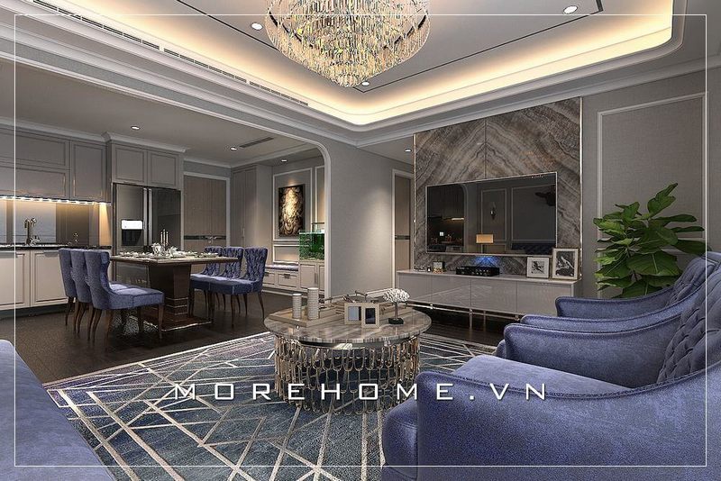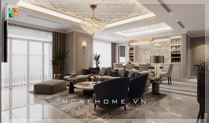 Bạn yêu thích phong cách tân cổ điển hoàng gia thì đừng nên bỏ lỡ mẫu thiết kế phòng khách chung cư cao cấp này với các đồ nội thất tinh tế, độc đáo