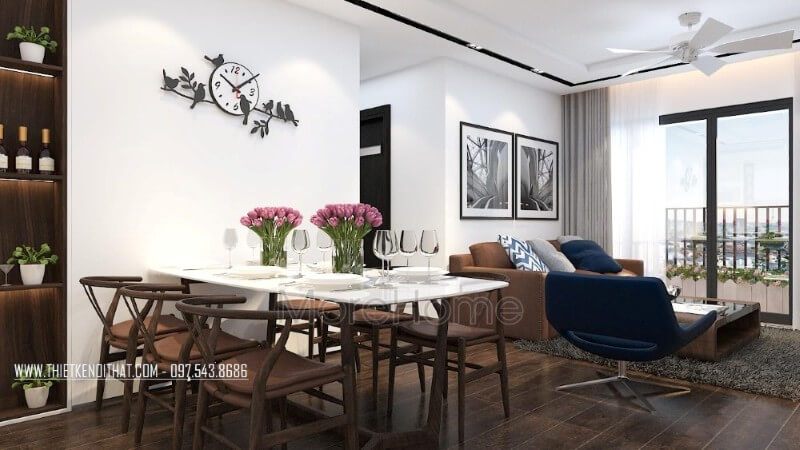 Mẫu bàn ăn khá đơn giản với thiết kế không cầu kỳ họa tiết, tone màu nâu đậm kết hợp gỗ tự nhiên giúp không gian trở nên mở, tạo sự đồng nhất cho không gian nhà chung cư