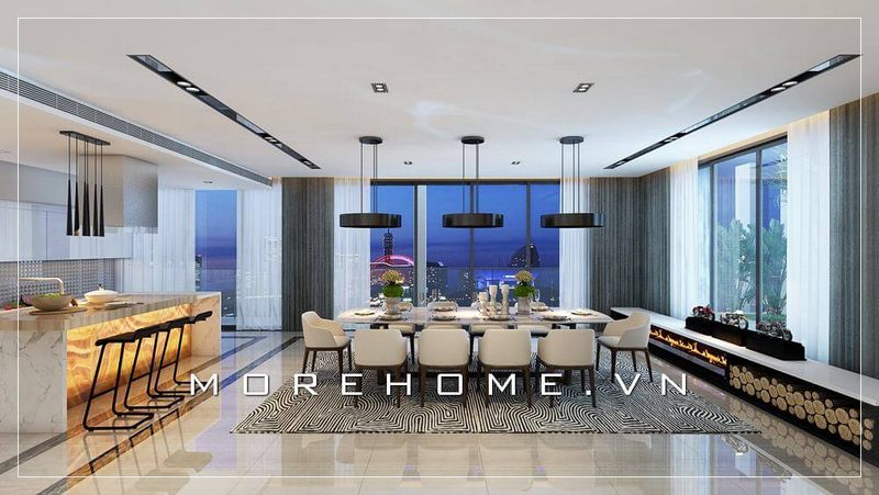 Mẫu bàn ăn hiện đại với thiết kế bàn ăn mặt đá cao cấp màu trắng, ghế eames chân sắt sơn tĩnh điện cho nội thất phòng ăn