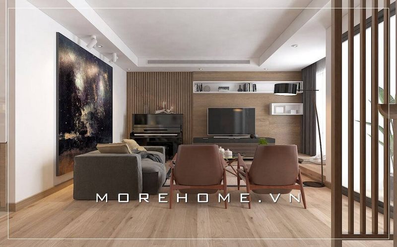 Gỗ trang trí kết hợp đồ nội thất hiện đại từ sofa, thảm trải, đèn trang trí đã tạo nên vẻ đẹp sang trọng, độc đáo cho phòng khách căn hộ chung cư.