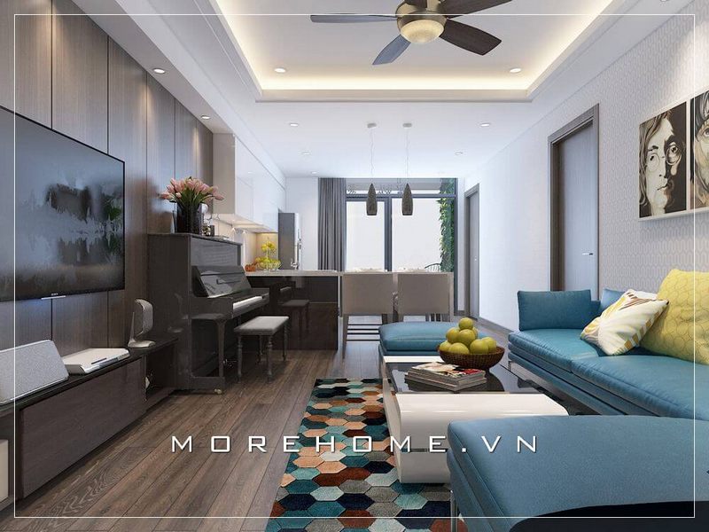 Với cách phối màu khéo léo từ sắc xanh nổi bật bạn sẽ tạo nên không gian phòng khách chung cư nhẹ nhàng, sang trọng