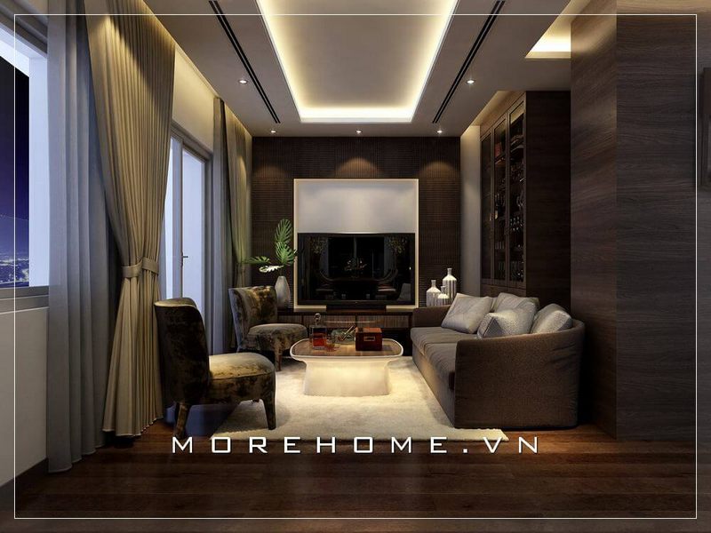 Mẫu thiết kế phòng khách chung cư đẹp sử dụng gỗ ốp sàn màu nâu sang trọng kết hợp nội thất hiện đại, độc đáo mang đến một căn phòng khách lí tưởng