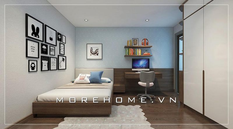Thiết kế giường ngủ con trai phong cách hiện đại, trẻ trung, ở không gian này, KTS cũng lựa chọn tone màu trắng chủ đạo mang lại cho khu vực phòng ngủ thêm cơi nới, rộng rãi hơn