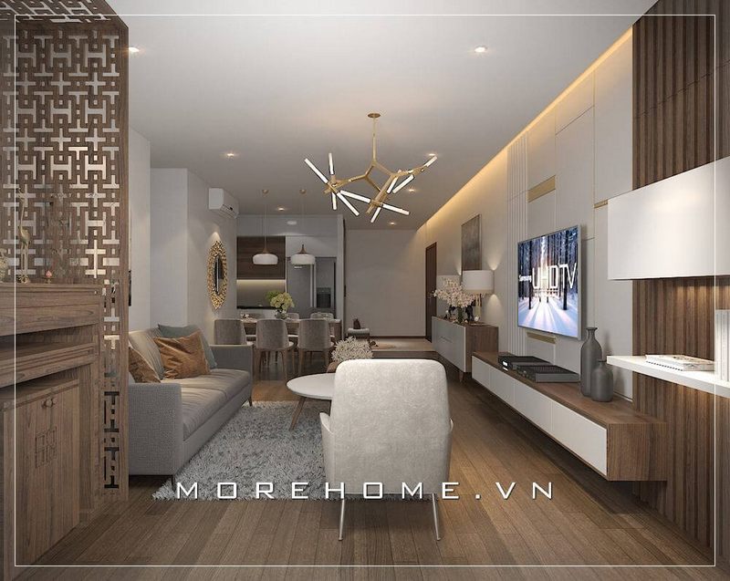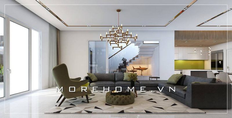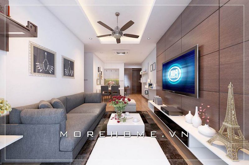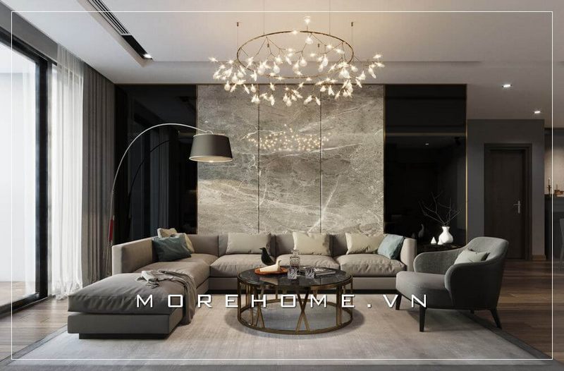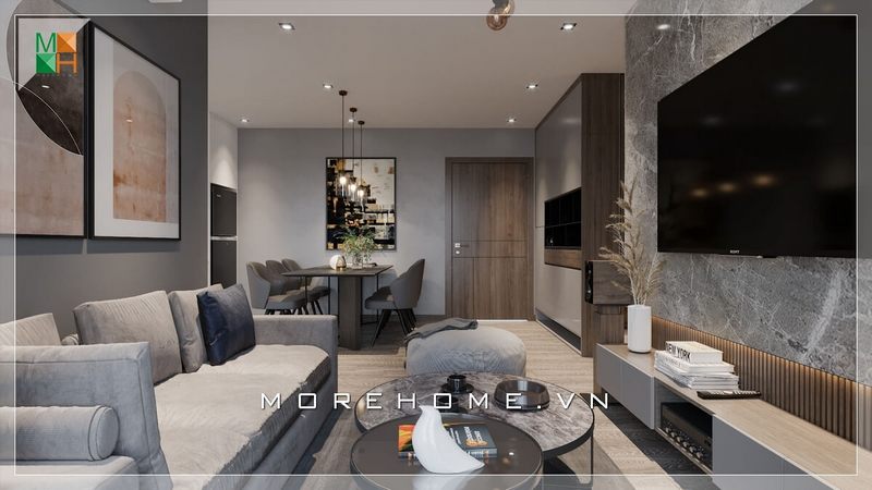 Không gian phòng khách căn hộ chung cư hiện đại vừa thoáng đãng vừa tiện lợi, gần gũi với tâm điểm là bộ sofa góc bọc vải màu xám tinh tế.
