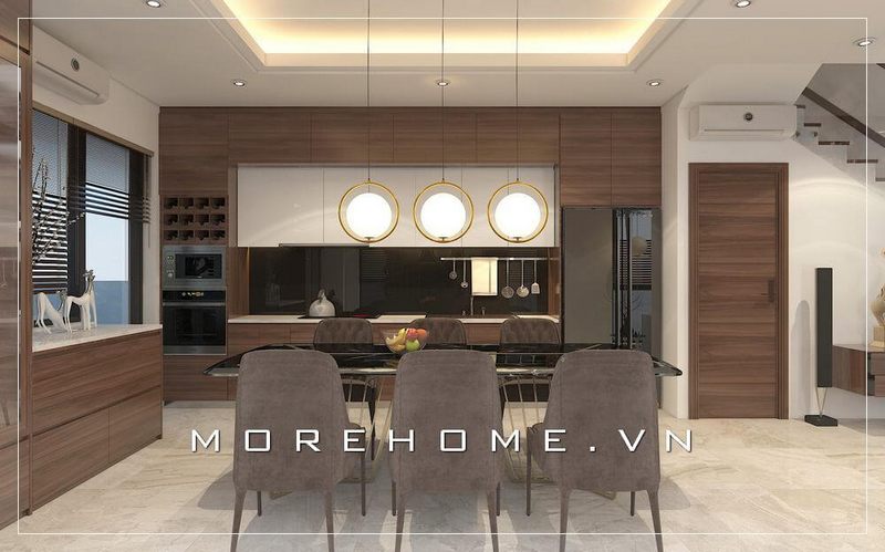 Thiết kế phòng ăn hiện đại với mẫu bàn ăn gỗ kết hợp mặt bàn đá sang trọng, ấm cúng