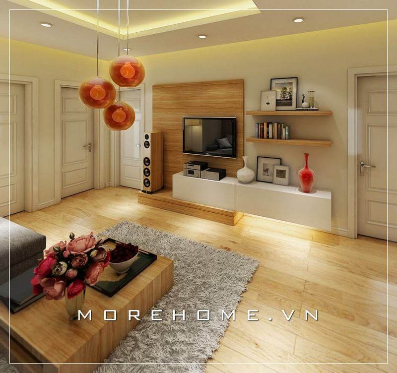Kệ ti vi gỗ công nghiệp được thiết kế nối liền với vách ốp tường gỗ vẫn đảm bảo tính thẩm mỹ cũng như công năng sử dụng
