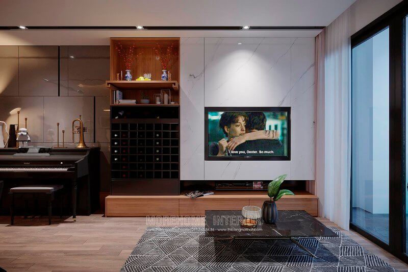 Kệ to vi gỗ công nghiệp với tone màu vàng trầm ấm là điểm nhấn cuốn hút cho khu vực tiếp khách của gia chủ