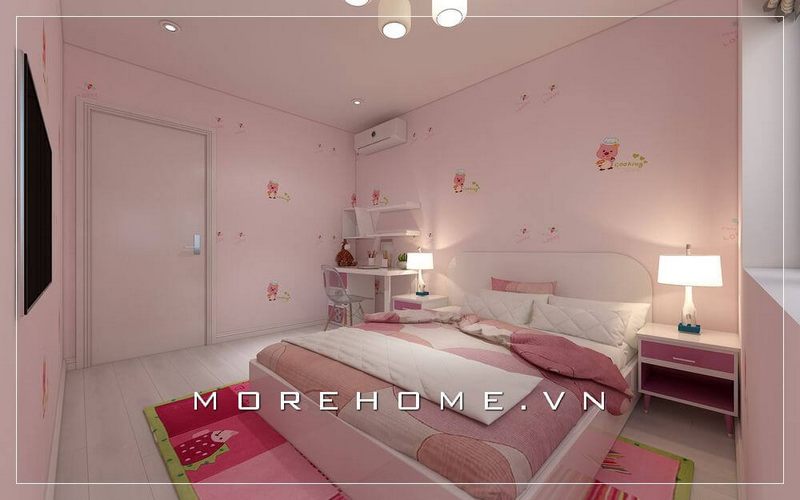 Trang trí phòng ngủ bé gái đẹp và tiện nghi, bàn làm việc hiện đại đơn giản với kệ sách là các thanh ngang tạo sự thoải mái không quá gò bó