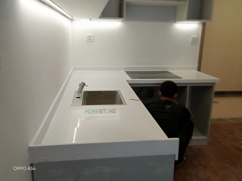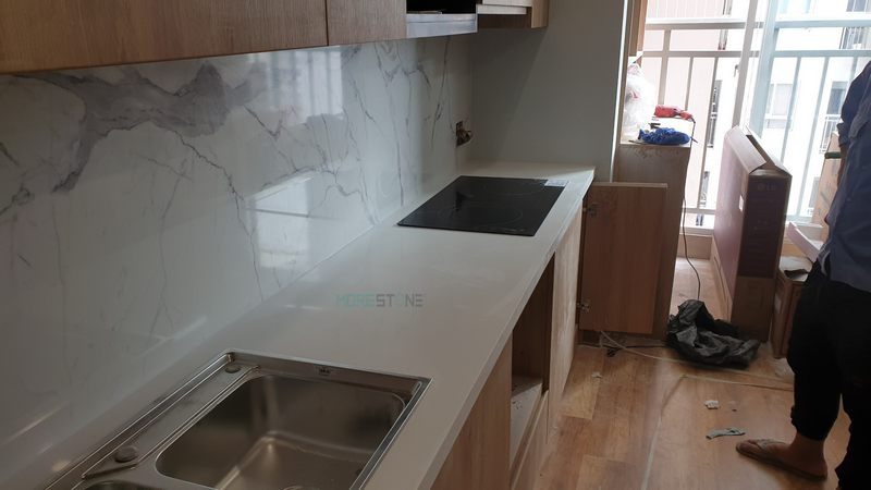 Đá ốp bàn bếp màu trắng với ưu điểm sáng bóng nhẵn mịn khả năng chống thấm và chịu nhiệt tốt.