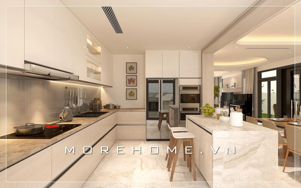 Tủ bếp cao cấp được sử dụng chất liệu công nghiệp phủ bóng gương tạo chiều sâu cho không gian phòng kết hợp sáng tự nhiên kết và tone màu trắng chủ đạo giúp không gian trở nên vô cùng thu hút, hiện đại hơn.
