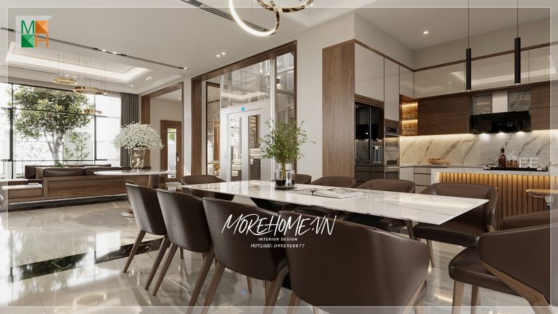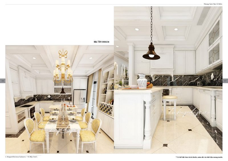 Thiết kế phòng bếp - ăn màu trắng theo phong cách tân cổ điển tương phản với đá ốp tường bếp màu đen huyền bí là lựa chọn hoàn hảo cho cả biệt thự, nhà phố, chung cư cao cấp.