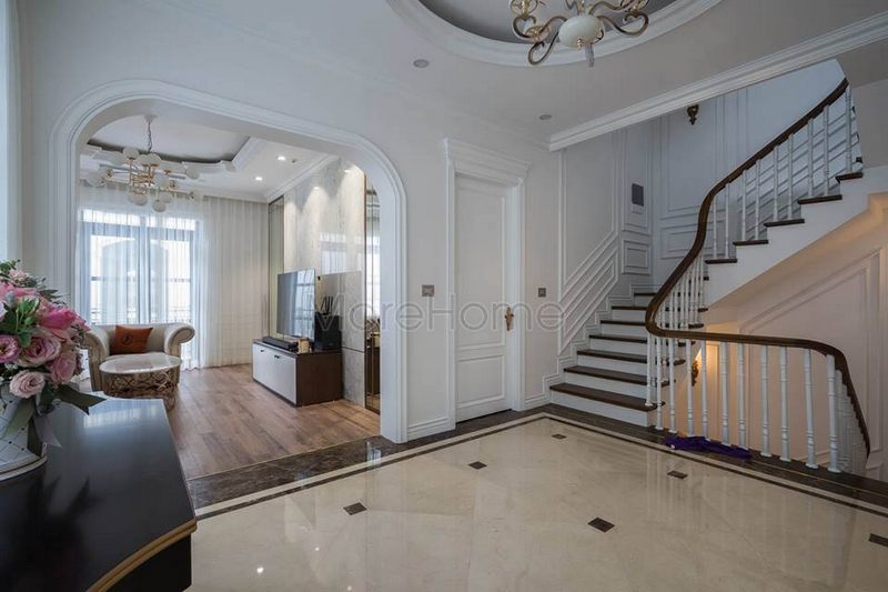 Tay vịn gỗ được sử dụng để thiết kế cầu thang, cùng với các con tiện nhỏ giúp tối ưu hóa không gian của ngôi nhà.