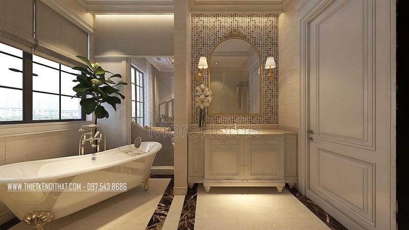 Để tạo nên một không gian phòng tắm biệt thự đẹp mắt, hãy sử dụng mẫu cửa gỗ màu trắng tân cổ điển để làm điểm nhấn cuốn hút.