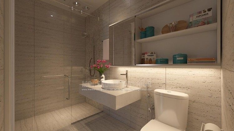 Kệ tủ treo tường gỗ công nghiệp màu trắng sắp xếp khoa học các đồ dùng trong phòng tắm ngăn nắp gọn gàng và dễ tìm kiếm tạo nên thẩm mỹ hiện đại.