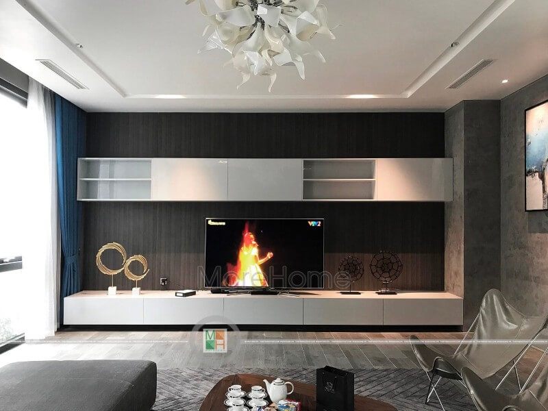 Thi công nội thất phòng khách đẹp với kệ tivi gỗ hiện đại cao cấp tại biệt thự Vinhomes Riverside Long Biên Hà Nội