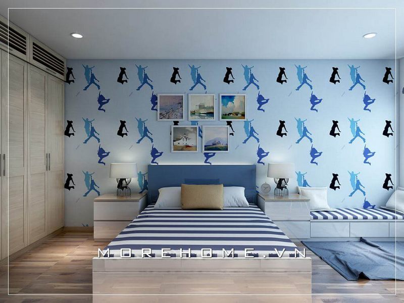 Nội thất phòng ngủ trẻ em có phong cách hiện đại, đơn giản với học tiết giấy dán tường độc đáo giúp tạo nên sự sinh động, thông thoáng và rộng rãi.