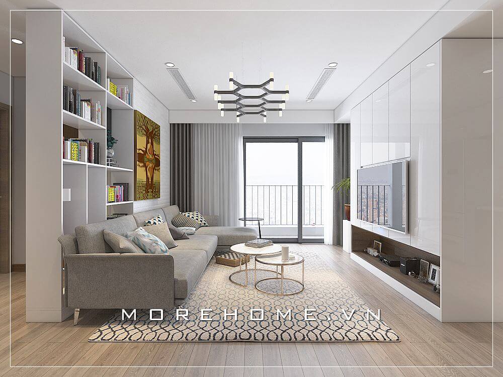 Không gian phòng khách căn hộ chung cư vừa tiện nghi, thoáng đãng lại ấm cúng gần gũi với tâm điểm là bộ sofa văng bọc vải hiện đại sắc kem nhẹ nhàng.