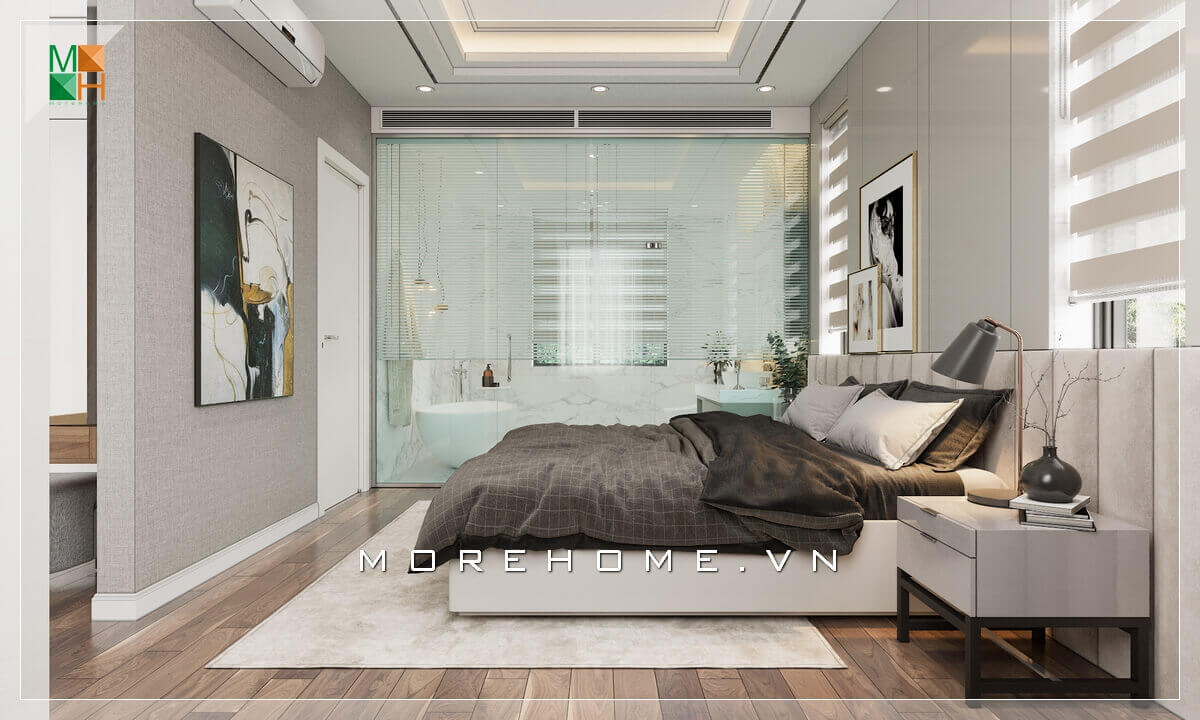Phòng ngủ hiện đại được thiết kế với sắc trắng tinh tế nhẹ nhàng cùng với việc bố trí vách kính đón ánh sáng trực tiếp đem đến những cảm giác thích thú, thoải mái cho những phút giây thư giãn.